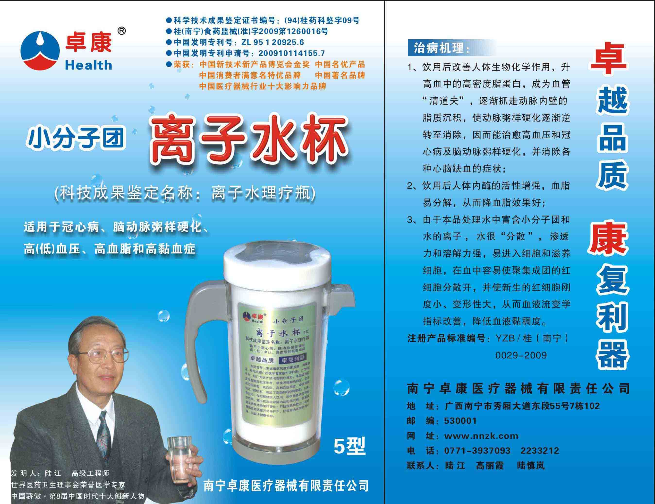 - -----南寧卓康微小水科技有限公司原為南寧卓康醫療器械有限責任公司 ,用戶普遍反饋高血壓患者飲用2—5個月,癥狀消除,不再服藥,治愈了高血壓; 冠心病患者,包括已做和未做支架或搭撟手術者,經3—5個月飲用,消除心痛、胸悶、早搏、房顫和心絞痛等癥狀,逆轉至消除動脈粥樣硬化和斑塊,一年左右治愈冠心病,心腦電圖正常,經冠脈造影掃描無明顯狹窄,表明冠心病痊愈;糖尿病人飲用3-10個月,血糖尿糖正常,治愈2型糖尿病; 并且使前列腺增生、低血壓、腦萎慢性咽喉炎、慢性氣管炎、支氣管炎、哮喘、矽肺病、甲亢、慢性胃腸炎、膽囊炎、慢性腎炎、腎衰、風濕性關節炎、痔瘡和濕疹皮炎及中風癱瘓或偏癱失語后遺癥等不藥而愈,且多病同治,無需終生服藥,彌補了幾千年來藥物的欠缺,使“微小水”成為人類消除高血壓、冠心病和糖尿病的寶貴資源。腦動脈粥樣硬化、低血壓和前列腺增生患者,一般飲用四個月痊愈;中風后遺癥患者,一般飲用8個月痊愈。請詳閱《用戶反饋》欄目中大量患者的反饋信、檢測報告,有的還附照片。產品屢獲大獎,論文也屢獲一等獎。廣大用戶好評不斷,有口皆碑。